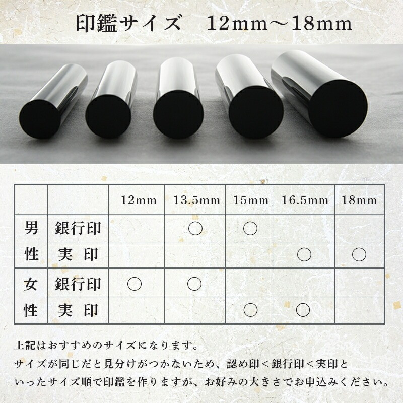 | 容量 | 印章 ・実印 (直径18mm×長さ60mm) 1本 ・銀行印 (直径15mm×長さ60mm) 1本 ※印鑑ケース(牛革)+収納ケース付き |