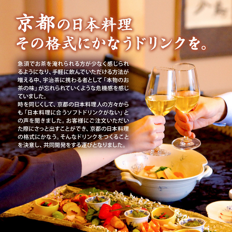 瓶入り宇治茶ドリンクは、「京都府宇治茶普及促進条例」を踏まえ、京都の料理界からも要望が高かった、宇治茶の有料ドリンクメニュー化を推進するために開発したもので、「特別な時間を提供する新しい宇治茶のかたち」をコンセプトに、玉露を使用した今までにない新しい商品です。