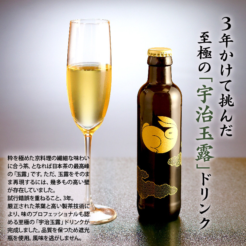瓶入り宇治茶ドリンクは、「京都府宇治茶普及促進条例」を踏まえ、京都の料理界からも要望が高かった、宇治茶の有料ドリンクメニュー化を推進するために開発したもので、「特別な時間を提供する新しい宇治茶のかたち」をコンセプトに、玉露を使用した今までにない新しい商品です。