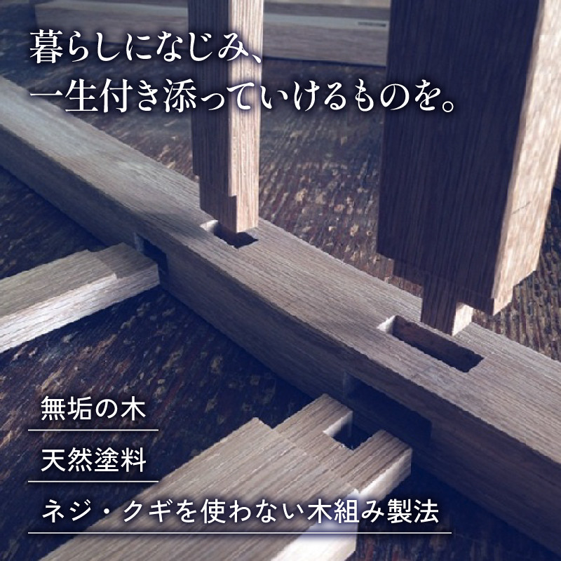一生ものとは「一生使える壊れないもの」ということではなく、「一生付き合っていけるもの」だと思います。それは【素材】【造り】【つかい手の心】その全てがあって成り立つものだと思います。家具は工房で組み上がった時が完成ではなく、使ってくださる方と幾十年と年を重ねる中で完成していきます。
