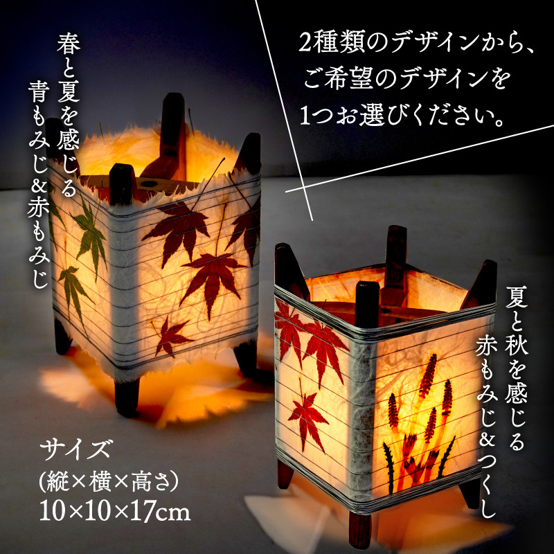 | 容量 | 縦10×横10×高さ17cm・240g / 天然木・丹後和紙・シルク糸/電球付 コード長さ:2m(中間スイッチ付) ランプ:10W(口金サイズE12) 色:青もみじ&赤もみじ ・ 赤もみじ&つくし ※商品により草花の配置が異なります。 |