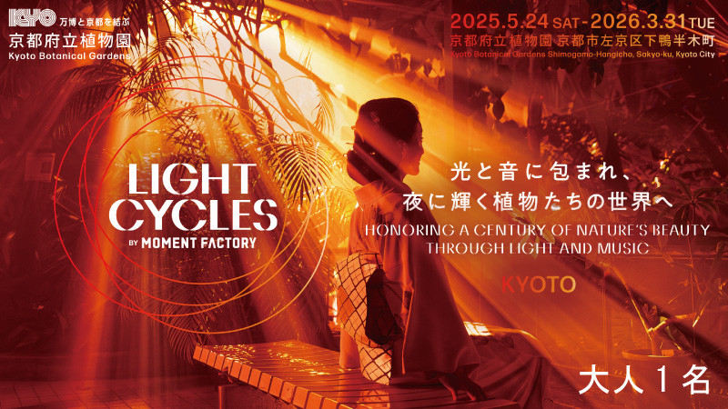 光と音に包まれ、夜に輝く植物たちの世界へ。今年も京都府立植物園で開催。 【~2026年3月16日受付】 京都府立植物園 LIGHT CYCLES KYOTO 前売券 大人1枚 チケット イルミネーション プロジェクションマッピング ライトアップ 夜 幻想的 デート イベント 家族 大人 観光 旅行 体験 遊び 関西 京都 植物園 夏休み クリスマス 人気 おすすめ 京都府 ふるさと納税