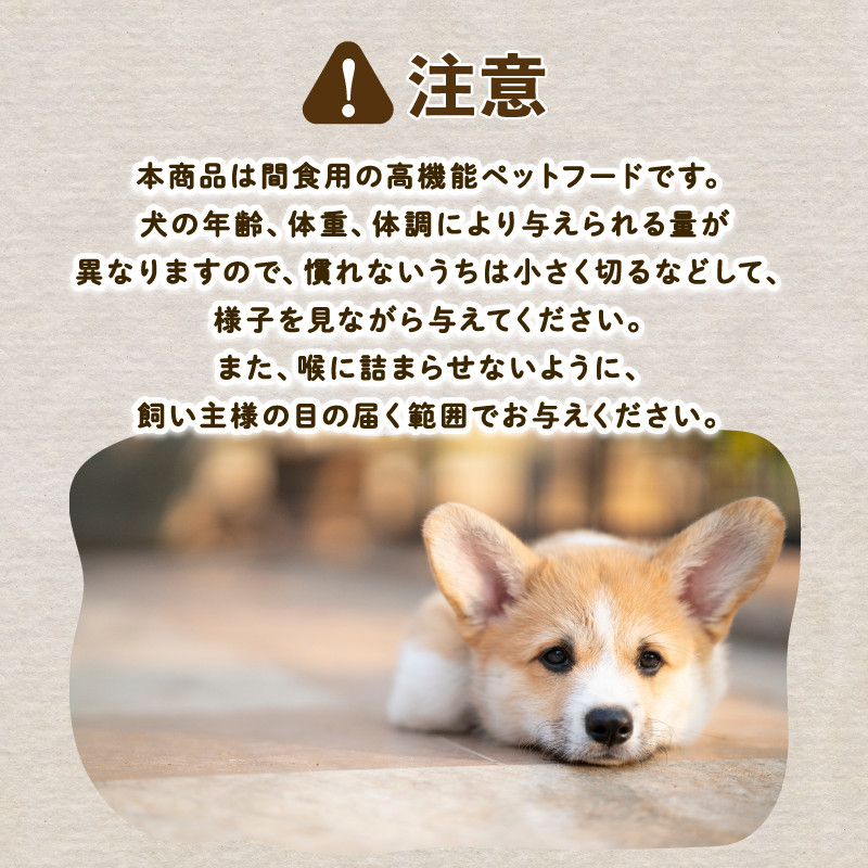 本商品は間食用の高機能ペットフードです。犬の年齢、体重、体調により与えられる量が異なりますので、慣れないうちは小さく切るなどして、様子を見ながら与えてください。また喉に詰まらせないように、飼い主様の目の届く範囲でお与えください。
