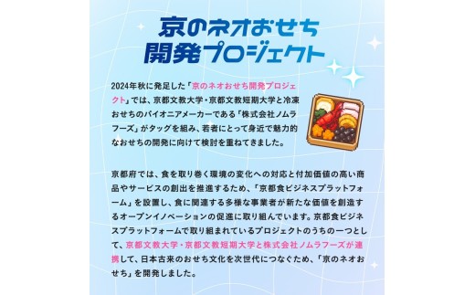 京都食ビジネスプラットフォームで取り組まれているプロジェクトのうちの一つとして、京都文教大学・京都文教短期大学と株式会社ノムラフーズが連携して、日本古来のおせち文化を次世代につなぐため、「京のネオおせち」を開発しました。