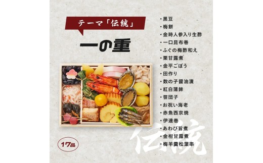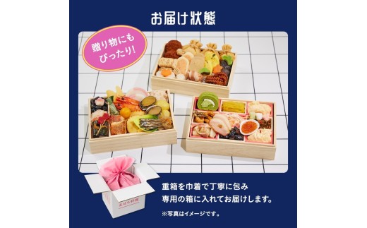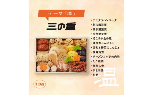 容量 | 【内容量】約2~3人前(三段重)/計42品目 【重箱サイズ(外寸)】約207mm×142mm×46mm×3段 ■お品書き 【一の重:テーマ「伝統」】 (全17品) 黒豆/梅餅/金時人参入り生酢/一口昆布巻/ふぐの梅酢和え/栗甘露煮/金平ごぼう/田作り/数の子醤油漬/紅白蒲鉾/笹団子/お祝い海老/赤魚西京焼/伊達巻/あわび旨煮/金柑甘露煮/梅羊羹松葉串 【二の重:テーマ「NEO」】 (全12品) 抹茶伊達ロール/モンブランきんとん/海老タルタル/ナッつくり/レモネードなます/ミートでよろ昆布/ペペロンごぼう/チョコ黒豆/数の子チーズ/いくらジュエル/カモ・ド・キャラメル/トリコローレ串 【三の重:テーマ「温」】 (全13品) デミグラハンバーグ/餅巾着旨煮/焼き湯葉煮/六角里芋煮/姫こうや含め煮/蓮根型こんにゃく/豆乳と野菜のしんじょ/椎茸旨煮/チーズ入りパテの肉巻/たこ照焼/梅型人参/手まり麩/松麩 |