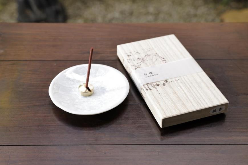 お香は通年通してお使いいただきやすい老山白檀のスリム線香です。涼やかな甘さのある香りをお楽しみください。