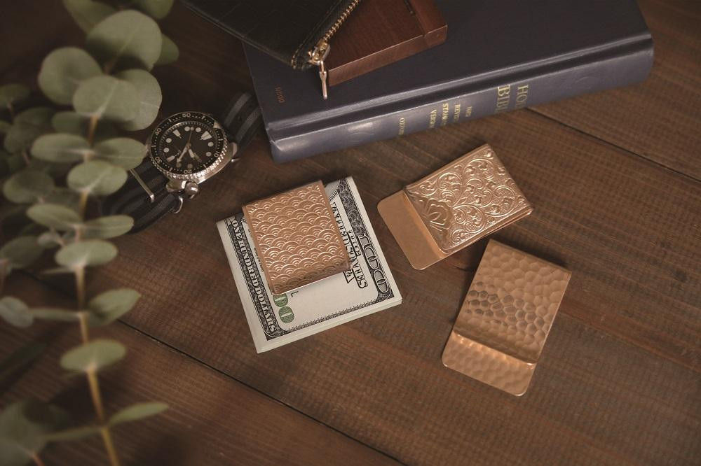 神社仏閣や仏壇の装飾に使われる伝統的な“かざりかなぐ”(錺金具)の技術を活かして作ったマネークリップです。