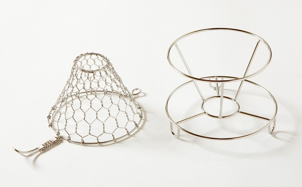 昭和8年(1933)創業の手編みの金網細工店。手の感覚だけで、均等な網目に編み上げる圧巻の伝統技で、現代の生活に求められる道具を作っています。焼き網やコーヒードリッパー、調理器具等は、プロの料理人から主婦、海外の方にも幅広く愛用されています。