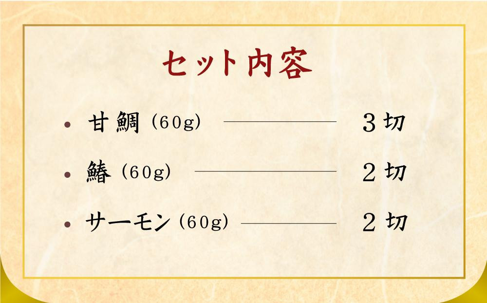 | 容量 | 甘鯛3切、鰆2切、サーモン2切…各60g |