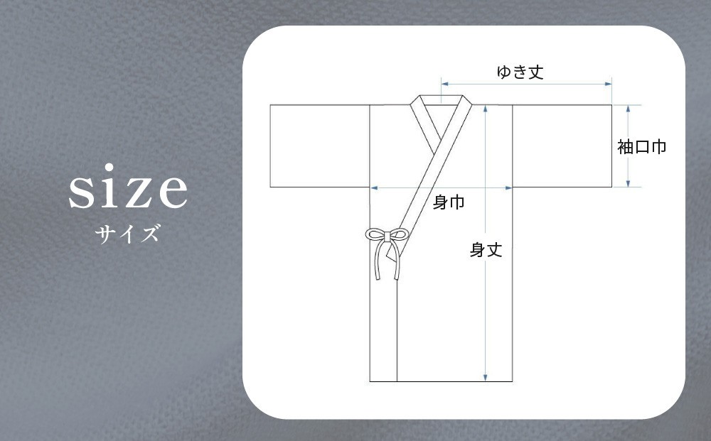 | 容量 | フリーサイズ(ユニセックス) ・着丈:100cm ・ゆき丈:67cm ・袖口巾:25cm ・身巾:60cm |