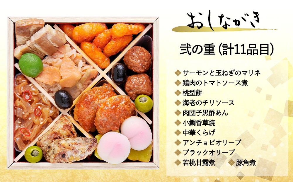 | 容量 | 【内容量】約2人前(二段重)/計25品目 【重箱サイズ(外寸)】約150mm×150mm×50mm×2段 ◆お品書き 【壱の重】(計14品目) たたきごぼう/金時人参入り生酢/帆立ひもの柚子和え/数の子醤油漬/黒豆/栗甘露煮/一口昆布巻/お祝い海老/伊達巻/笹団子/手まり麩/松麩/梅型人参/梅羊羹松葉串 【弐の重】(計11品目) 豚角煮/サーモントラウトのマリネ/鶏肉のトマト煮/桃型餅/海老のチリソース/肉団子黒酢あん/小鯛香草焼/中華くらげ/若桃甘露煮/ブラックオリーブ/アンチョビオリーブ ※仕入れ状況等により、予告なくお品書きを変更する場合がございます。予めご了承ください。 |