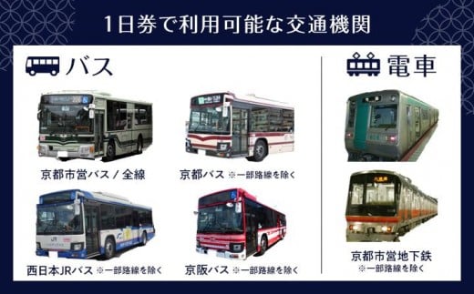 京都市営地下鉄・バス全線、京都バス、京阪バス、西日本JRバス(各社とも一部路線を除く)が乗り放題。