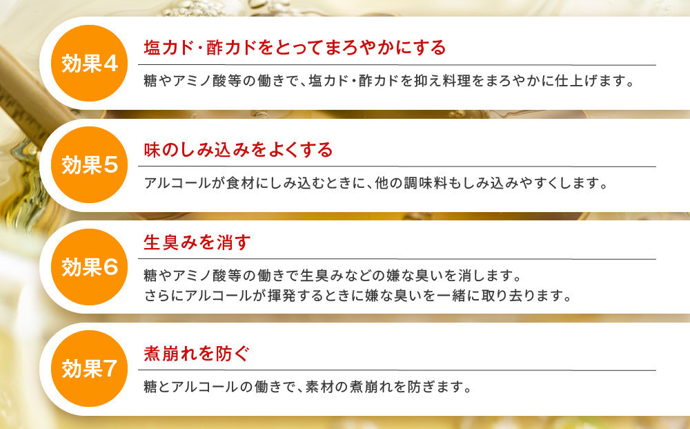 タカラ本みりんに含まれる糖やアミノ酸等の働きで、塩カド・酢カドを抑え料理をまろやかに仕上げます。