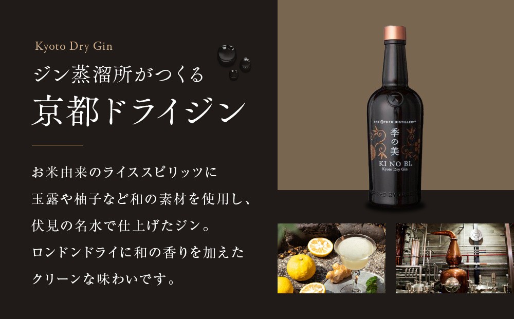 「季の美 京都ドライジン」は、お米からつくるライススピリッツとボタニカルに玉露や柚子、赤松や山椒など日本ならではの素材を積極的に取り入れ、伏見の柔らかくきめ細やかな伏流水を使用。ジュニパーベリーの効いたロンドンドライスタイルに「和」のエッセンスを加えたクリーンな味わいをお楽しみいただけます。