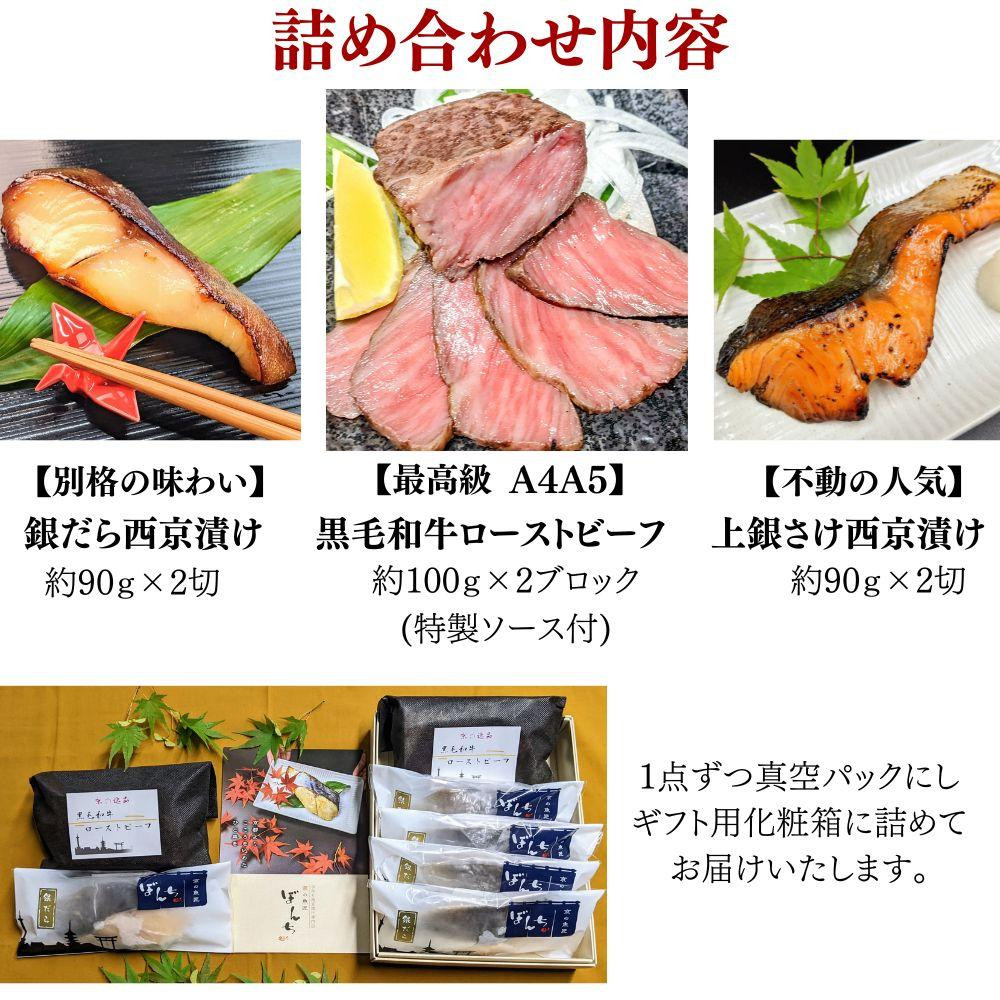 【最高級 A4A5】黒毛和牛ローストビーフ・西京漬け2種4切、計5点 詰め合わせ〜極一段〜