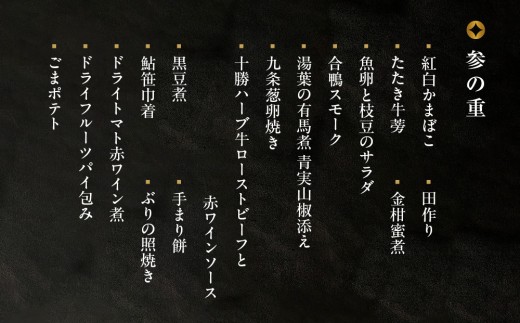 容量 | 三段重 51品目 約5人前 重箱サイズ(外寸)25.0×25.0×16.0(cm) 【壱の重】 ポークソーセージスライス/生ハム/牛肉のしぐれ煮/蟹風味新丈/いか松笠白焼/フロマージュパイ/蒸し鶏のジェノベーゼ/海老含め煮/一口昆布巻/筑波巻/紅白なます柚子風味/鱈の旨煮/わかめ中華風味/鮑醤油煮/味付数の子/このしろ砧巻 【弐の重】 サーモントラウトとホウレンソウのテリーヌ/貝のマスタード風味/タルト・オ・ノア/ガトーショコラ/帆立香草焼ムニエル風/チェダーシュリンプサラダ/蛸のやわらか煮/帆立とあおさの柚子胡椒和え/味付イクラ/きんとん/栗甘露煮/渋皮栗煮/ローストポーク/牛肉のスモーク/にしん昆布〆/オニオンマリネとドライクランベリー/スモークサーモントラウト バラ造り/カシューナッツ飴炊き/青桃甘露煮 【参の重】 紅白かまぼこ/田作り/たたき牛蒡/金柑蜜煮/魚卵と枝豆のサラダ/合鴨スモーク/湯葉の有馬煮 青実山椒添え/九条葱卵焼き/十勝ハーブ牛ローストビーフと赤ワインソース/黒豆煮/手まり餅/鮎笹巾着/ぶりの照焼き/ドライトマト赤ワイン煮/ドライフルーツパイ包み/ごまポテト ◆仕入れなどの状況により、予告なく内容を変更する場合がございます。あらかじめご了承ください。 |