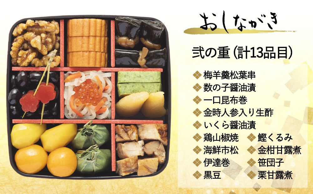 | 容量 | 【内容量】約3人前(三段重)/計33品目 【重箱サイズ(外寸)】約 径148mm×148mm×45mm×3段 ◆お品書き 【壱の重】(計9品目) 梅甘露煮/鱈旨煮/たたきごぼう/田作り/豚角煮/紅白蒲鉾/お祝い海老/赤魚西京焼/手まり麩 【弐の重】(計13品目) 鰹くるみ/伊達巻/一口昆布巻/黒豆/金時人参入り生酢/いくら醤油漬/海鮮市松/数の子醤油漬/栗甘露煮/笹団子/鶏山椒焼/金柑甘露煮/梅羊羹松葉串 【参の重】(計11品目) 黒豆がんも含め煮/湯葉茶巾/高野豆腐の含め煮/梅型こんにゃく/椎茸旨煮/ごぼう煮〆/海老旨煮/枝豆入り信田巻/筍煮〆/梅型人参/若桃甘露煮 ※仕入れ状況等により、予告なくお品書きを変更する場合がございます。予めご了承ください。 |
