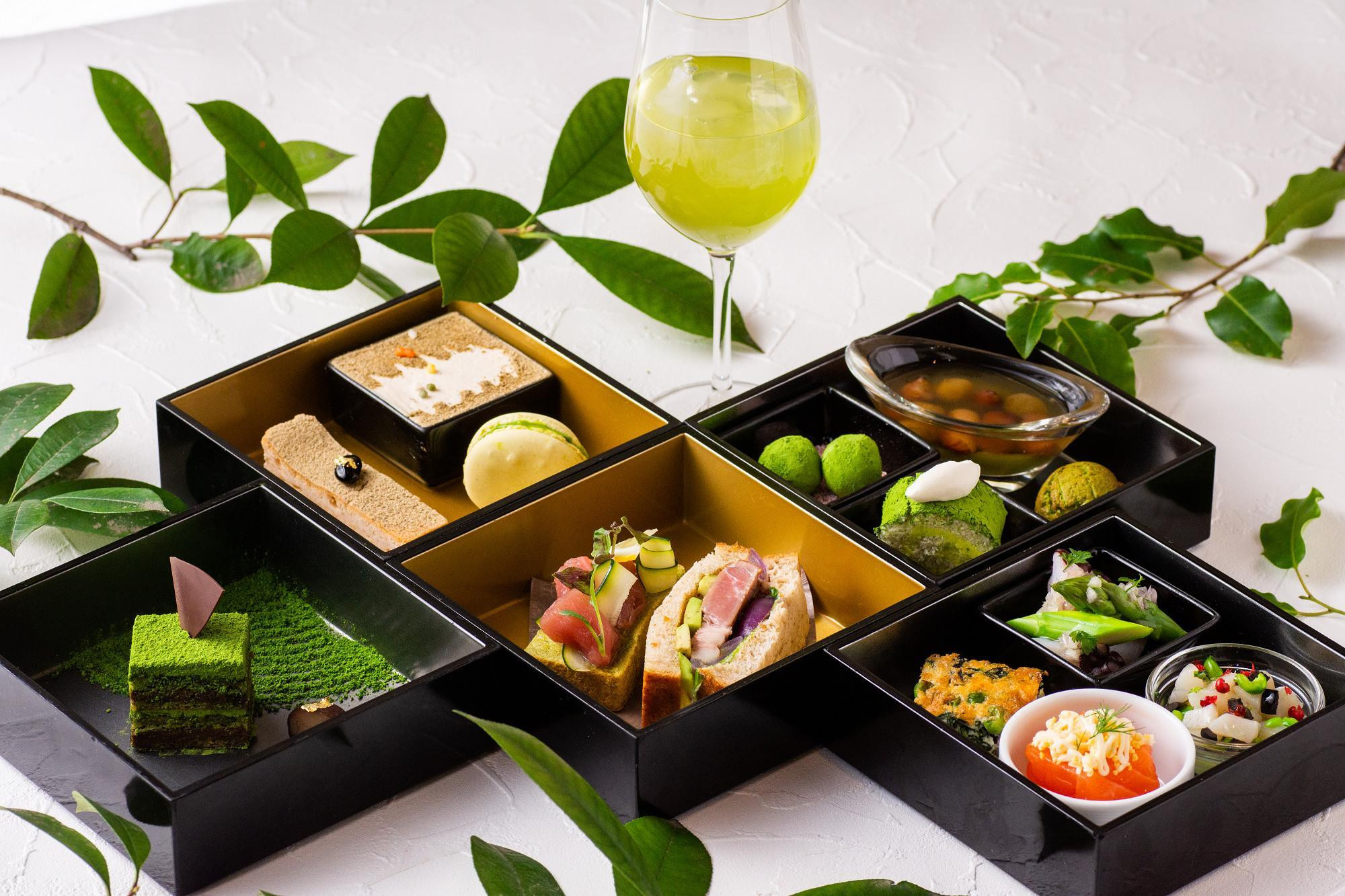 八坂の塔をイメージした五段のお重でご用意するスイーツや軽食は、アカガネリゾートのパティシエが丁寧にお作りした自慢のラインナップ。合わせてお愉しみいただくお飲み物は、上林春松本店のオリジナル煎茶、そしてサンフランシスコ発のティーブランド「Mighty Leaf」のオーガニックティーと、こだわりの詰まった贅沢なラインナップをおかわり自由にご堪能いただけます。