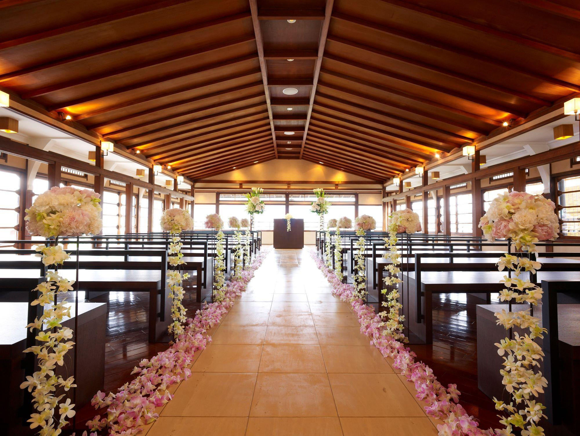 鮒鶴京都鴨川リゾートの最上階、開放的でモダンなチャペルをご利用いただけます。お食事後などに、チャペルにお呼びしサプライズプロポーズ。