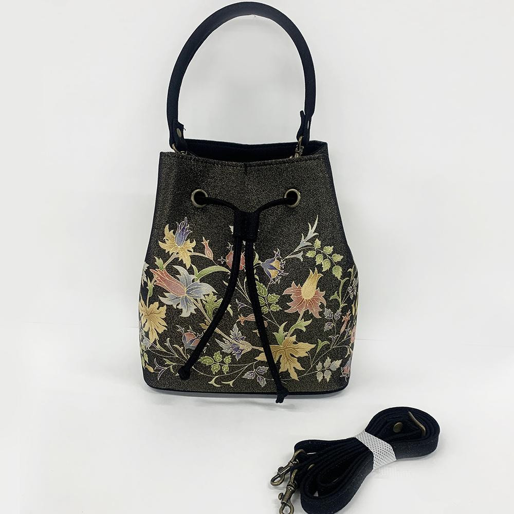 | 容量 | V&A京友禅巾着バッグ 【色展開】オフ・グリーン・ブラック(合計3色展開)よりお選びください 【サイズ(約)】横18cm×高さ21cm×幅10cm 【重さ(約)】163g 【素材】絹、一部合成皮革、裏地=レーヨン、ハンドル=合成皮革 ※ショルダーストラップ付(長さ64~115cm/調節取り外し可)、内側にオープンポケット1個有、底ビス付 |