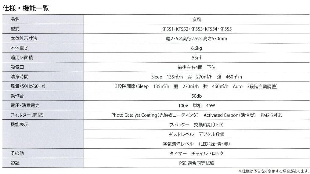 | 容量 | 光触媒空気清浄機「京風」1台 <仕様・機能> 品名:京風 型式:KF55-YS 本体外形寸法:幅276×奥行276×高さ570mm 本体重さ:6.6kg 適用床面積:55平方メートル 吸気口:前後左右4面 下位 清浄時間:Sleep 135平方メートル/h・弱270平方メートル/h・強460平方メートル/f 風量:3段階調節(Sleep・弱・強) 動作音:50db フィルター(筒型):Photo Catalyst Coating(光触媒コーティング) Activated Carbon(活性炭) PM2.5対応 機能表示:フィルター 交換時期(LED) ダストレベル デジタル数値 空気清浄レベル (LED:緑・青・赤) その他:タイマー チャイルドロック 認証:PSE適合同等試験 |