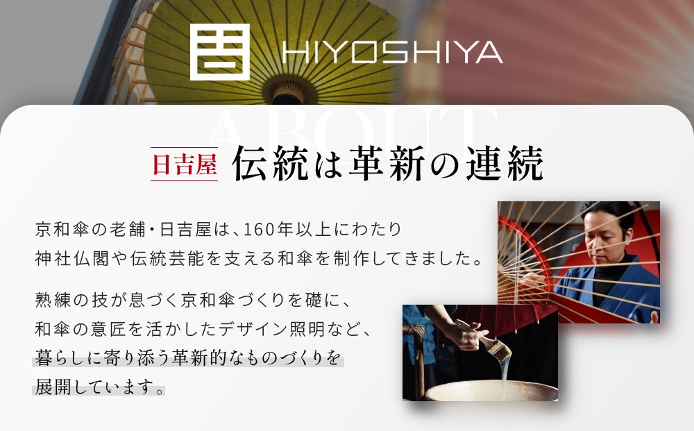 | 容量 | 1セット ランプシェード、灯具、 100W E26 乳白色ボール球×1、取扱説明書 φ708mm×H355mm カラー: (ナチュラル白/Natural White)、(黒/Black)、(赤/Red)、(紫/Purple)、(蜜柑色/Mikan-Iro)、(白茶色/Shiracha-Iro)、(山吹色/Yamabuki-Iro)、(松葉色/Matsuba-Iro)、(萌黄色/Moegi-Iro)、(空色/Sora-Iro)、(藤色/Fuji-Iro)、(朱鷺色/Toki-Iro)よりお選びいただけます。 ■日吉屋について 日吉屋は江戸時代後期創業、現存する唯一の「京和傘」の技法を継承する工房です。創業より160年以上にわたり伝統の技を受け継ぎ、各種和傘の制作や、修復を行っています。 2004年に現代表の西堀耕太郎が五代目として就任、「伝統は革新の連続/Tradition is Continuing Innovation」を企業理念として掲げ、伝統の継承のみならず、京和傘の構造や伝統技術を活かしたデザイン照明などの開発を行っています。 国内はもとより、海外にも展開するようになりました。 |