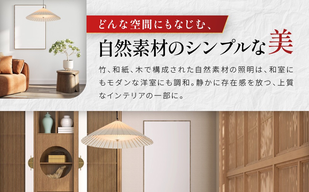 放射線状に広がる竹の繊細なデザインは、まるで和傘が空間に広がるような美しさを演出。和紙を通した柔らかな光が、温かく穏やかな雰囲気を生み出し、どこか懐かしく落ち着いた空間を作り上げます。