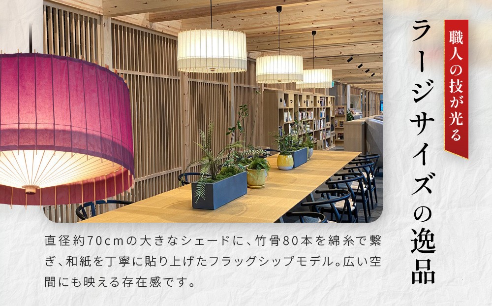 和傘と同様、1本の竹を均等に割って加工した親骨、小骨計40組(計80本)を職人が1本ずつ綿糸でつなぎ、その上に和紙を貼って仕上げています。HGの中でもラージサイズ(直径708mm×高さ355mm)にあたる本品は、広い空間にも映えるインパクトが魅力です。100W電球1灯のおだやかな灯りで、6~8畳程度のお部屋を心地よく照らします。通常の照明よりやや控えめな照度は、日本の「陰影礼賛」の精神にも通じています。広めのリビングなどでは、部分照明と組み合わせることで、部屋の印象にメリハリをつけられます。