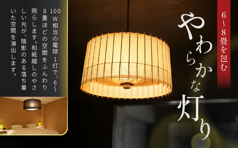 放射線状に広がる竹の繊細なデザインは、まるで和傘が空間に広がるような美しさを演出。和紙を通した柔らかな光が、温かく穏やかな雰囲気を生み出し、どこか懐かしく落ち着いた空間を作り上げます。