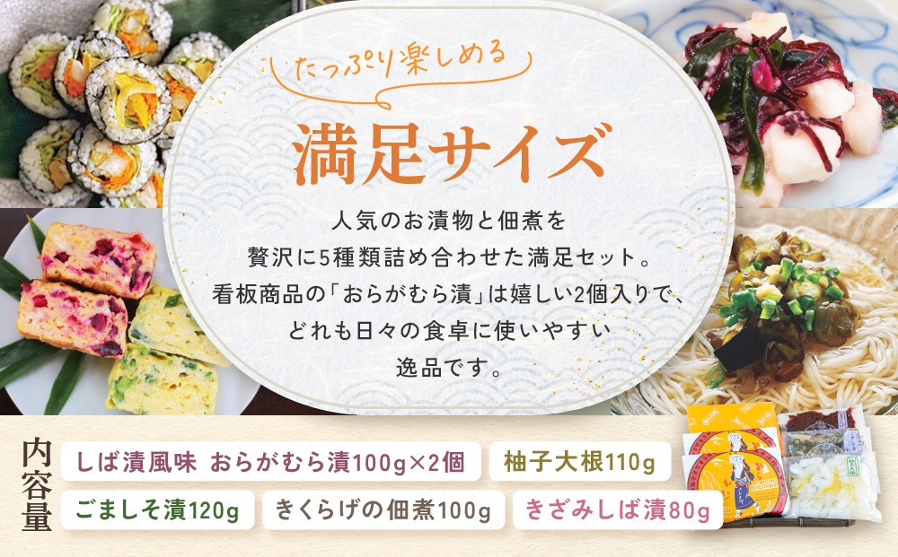 | 容量 | 【Dセット内容】 ・しば漬風味 おらがむら漬100g×2個 ・柚子大根110g ・ごましそ漬120g ・きくらげの佃煮100g ・きざみしば漬80g |