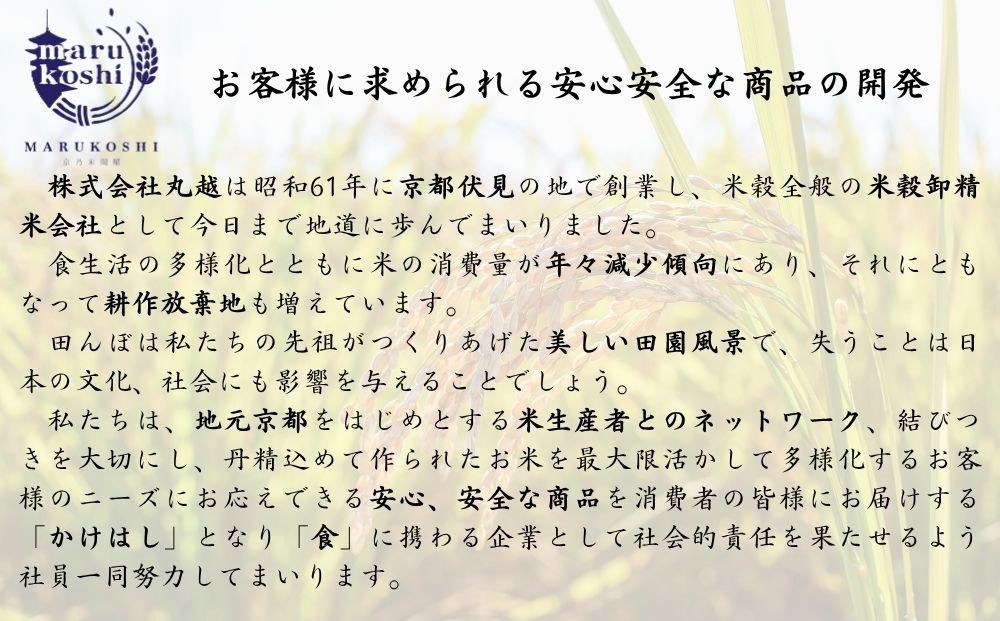 「丸越」は、地元京都をはじめとする米生産者とのネットワーク、結びつきを大切にし、丹精込めて作られたお米を最大限に活かして、お客様のニーズにお応えできる安心、安全な商品を消費者の皆様にお届けいたします。