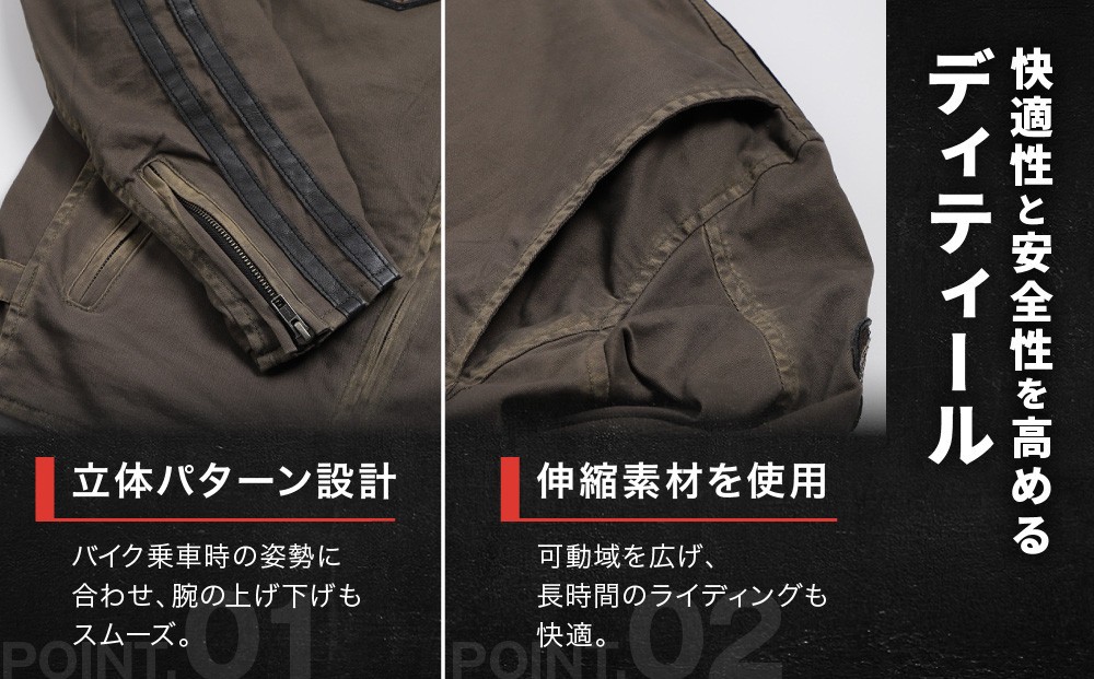 バイク乗車時の姿勢を考慮した立体的なパターンに伸縮性のある素材をかけ合わせる事により、腕の上げ下げもスムーズ。
