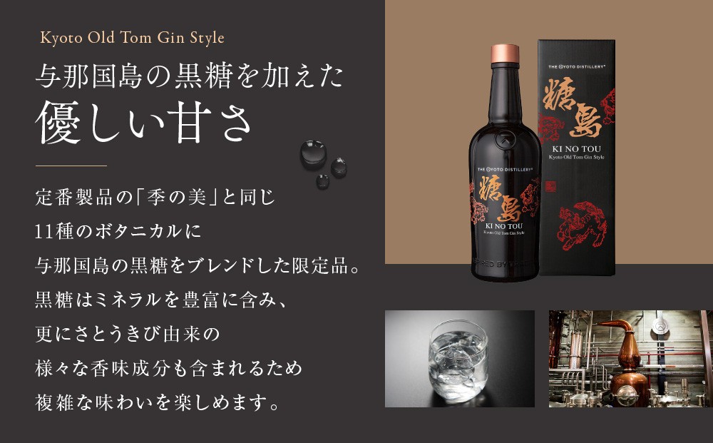 「季のTOU 京都オールドトムジンスタイル」は、定番製品の「季の美」と同じ11種のボタニカルに、与那国島の黒糖をブレンドした品です。