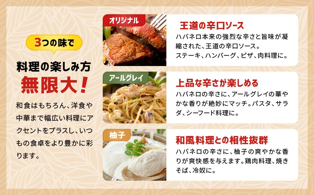 この自治体のポイントについてチョイス公式ポイント交換対象 京都産ハバネロ香る3種ソースセット 5箱 ハバネブロ3本セット (オリジナル・柚子・アールグレイ)×5箱 60ml×3 (5箱)|京都 ハバネロ ホットソース 辛口 調味料 人気セット[ 自然素材のハバネロソース 国産ハバネロ 化学調味料無添加 人気 おすすめ 調味料 香辛料 ソース ギフト プレゼント お取り寄せ 通販 送料無料 ふるさと納税 ]