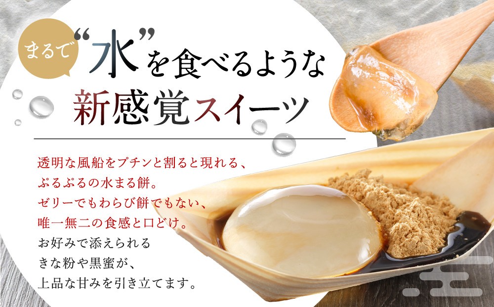 京都伏見稲荷大社近くに本店を構える「まるもち家」より、ゼリーでもない、わらび餅でもない、まるで水のように口の中で消えていく新感覚スイーツ「水まる餅」。