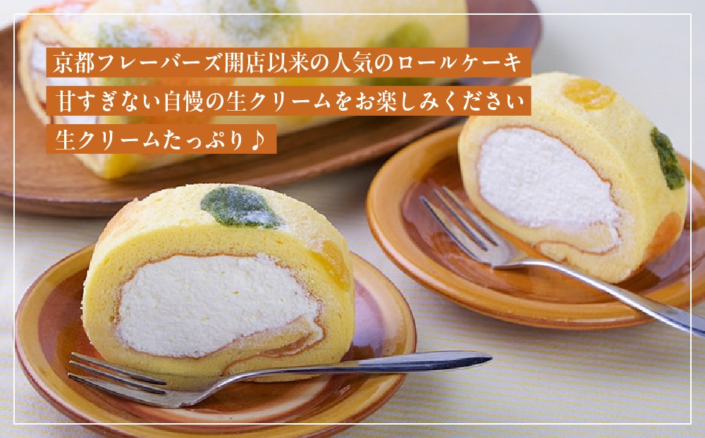 京都フレーバーズ開店以来の人気のロールケーキ。甘すぎない生クリームと わらび餅を練り込み、もっちりとした食感をお楽しみいただける和洋折衷な ロールケーキです。