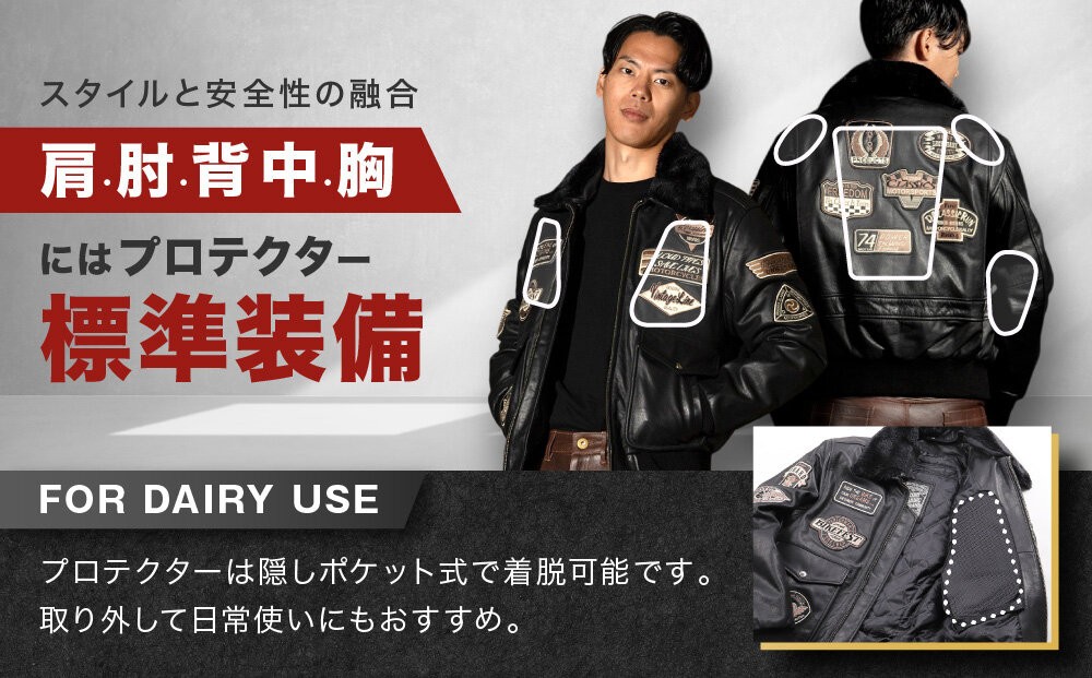 | 容量 | 【素材】 牛革 【カラー】 ブラック・ブラウン よりお選びいただけます。 【プロテクター装備箇所】 肩、肘、背中、胸 【サイズ】 S、M、L、XL、2XL、3XL よりお選びいただけます。 |