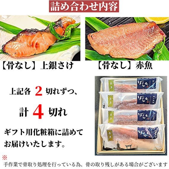 | 容量 | 4切れ(上銀さけ(骨取り)約80g×2切、赤魚(骨取り)約90g×2切) |