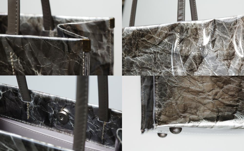 紙袋をモチーフにしつつも、底鋲や四隅の金具を用いて耐久性を高め、日常使いに適したデザインに仕上げています。持ち手には上品な印象かつ、タフな10mm幅のレザーを採用し。重さは見た目の容量に反して非常に軽く、内ポケット付きのため機能性にも優れています。