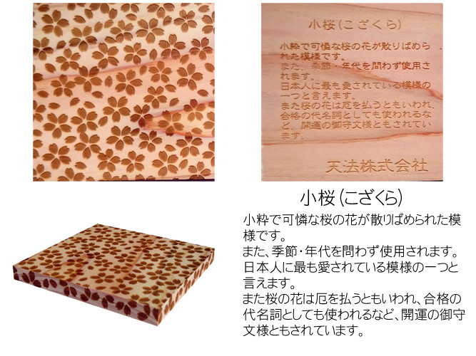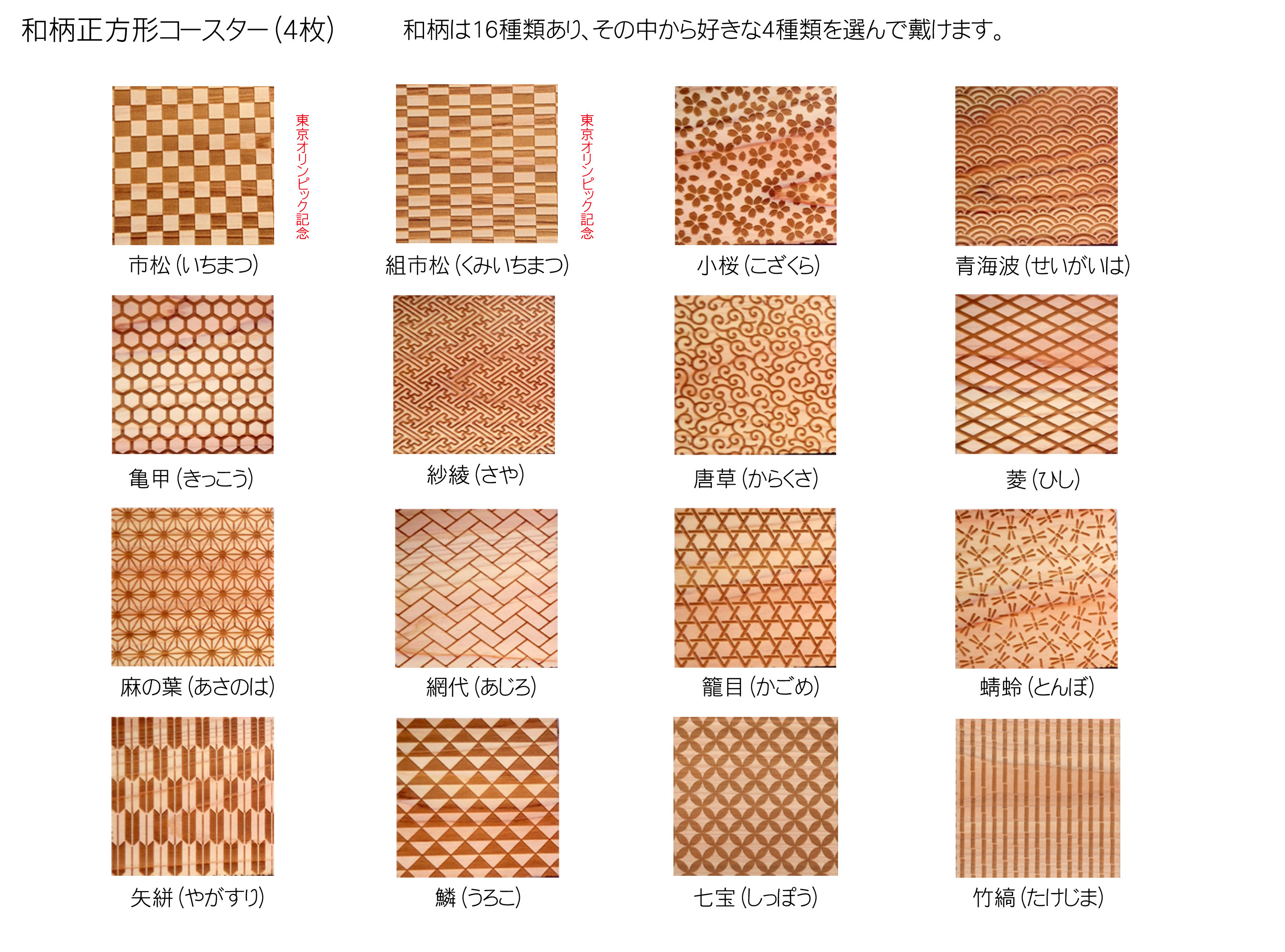 日本古来から伝わる文様を彫った丹波桧製コースター。裏面にはそれぞれの文様の意味の詳しい解説付。