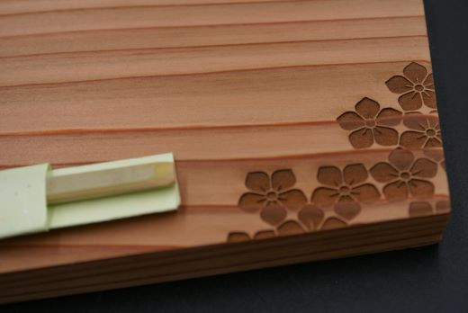 明智光秀の家紋である桔梗紋を丹波産の良質な杉に彫り刻んだ懐紙皿です。