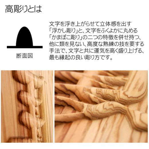 高彫りとは、文字を浮き上がらせて立体感を出す「浮かし彫り」と、文字をふくよかに丸める「かまぼこ彫り」の二つの特徴を併せ持つ、 高度な熟練の技を要する彫刻技法です。文字と共に運気を高く盛り上げる、縁起の良い彫り方の飾り駒です。木板は良質な美しい木目を持つ丹波産杉材で、「5」.「3」寸の吉祥数開運サイズ。