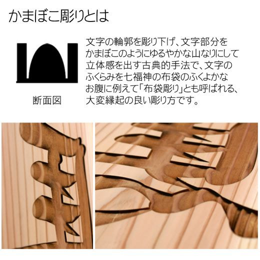 かまぼこ彫りとは、文字の輪郭を彫り下げ、文字部分を丸くかまぼこの様に緩やかな山なりにして立体感を出す古典的彫刻技法です。文字のふくらみを七福神の布袋のふくよかなお腹に例えて「布袋彫り」とも呼ばれる、大変縁起の良い彫り方の飾り駒です。木板は良質な美しい木目を持つ丹波産杉材で、「8」.「3」寸の吉祥数開運サイズです。