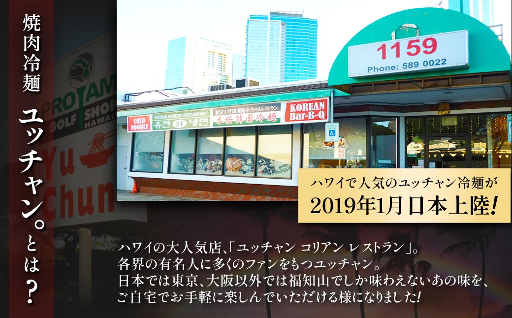 みぞれ状に凍ったシャリシャリスープと黒い細麺が特徴的な葛冷麺、通称”ユッチャン冷麺” 本店の味をご家庭でも楽しみたい!という多くのお客様のご要望にお応えし、ついに!”ユッチャン冷麺"を〈麺・スープ ・トッピング3種〉のセットにしてお届けします。 メディアでも話題の”ユッチャン冷麺"をぜひご家庭でご堪能ください。 牛骨と牛テールを6時間以上かけてとった出し汁に、数種類の野菜やフルーツを加えて作ったまろやかな甘みとコクが特徴の特製スープ。そして、韓国直輸入の葛粉、そば粉をブレンドしたヘルシーな葛冷麺。 コシがあり、もちつるっとした喉越しの麺と、キリッと冷えたシャリシャリスープのコンビネーションは、一度食べたら誰もがやみつき。ハワイの秘伝の味をそのまま再現した”ユッチャン冷麺”は多くのファンの心を掴んで離さない自慢の逸品です。 ※卵は付属しません。 【注意事項】 ※原則全ての冷凍食品の賞味期限は、到着後30日間を推奨させていただいております。保管方法・風味の面で到着後極力早い目にお召し上がりいただきますようお願い致します。 ※画像はイメージです。