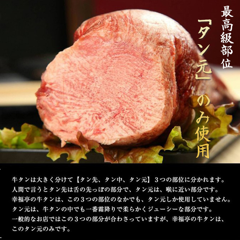 幸福亭で提供させていただく牛タンは、牛タンの最高級部位、希少部位の「タン元」のみ。