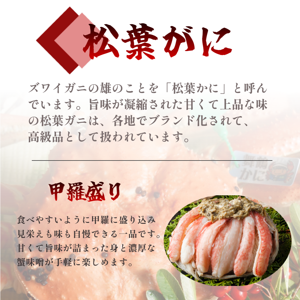 | 容量 | ・松葉がにの甲羅盛り 1個【加工前 活け目600-700gサイズ使用/加工後 甲羅を含み180-210g】 ・こっぺがに(セコがに)の甲羅盛り 3個【加工前 活け目160-180gサイズ使用/加工後 甲羅を含み70-80g】 ・特製だし醤油 |