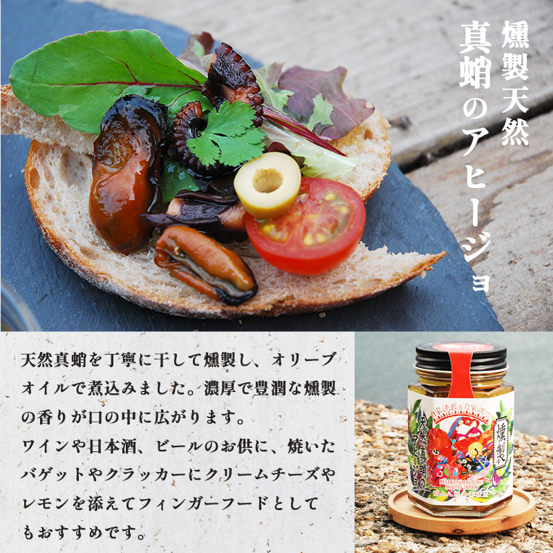 ●燻製天然真蛸のアヒージョ:真蛸(舞鶴産)、オリーブオイル(スペイン産)、にんにく(国産) 、塩(国産)てんさい糖(国産)
