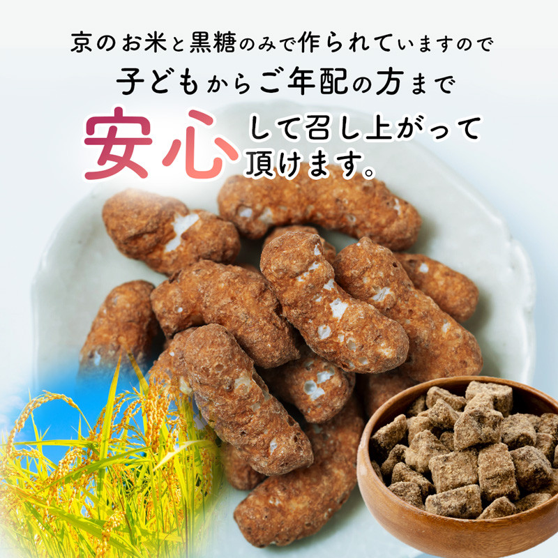 京都府のお米「京の輝き」と沖縄県産の黒糖のみを使った優しい味のお菓子です。