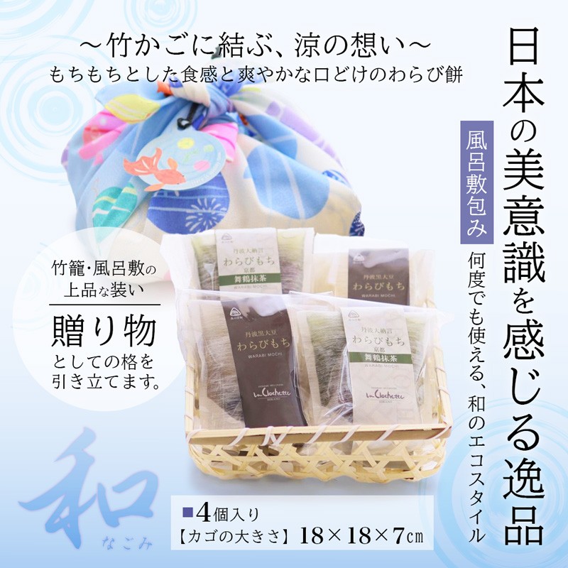 チョイスPayポイントと交換できる品 夏の贈り物にもピッタリなギフト用わらび餅セット 【7月~発送】 丹波素材のわらび餅「和」 竹籠&風呂敷包装 4個 紙袋付き :2種類 ( 丹波黒大豆 丹波大納言抹茶 ) | 和 黒蜜 手作り 自家製 黒糖 丹波黒豆 丹波大納言 抹茶 抹茶 わらび餅 和菓子 スイーツ お中元 夏ギフト 贈答用 プレゼント 竹籠 風呂敷包み 京都舞鶴
