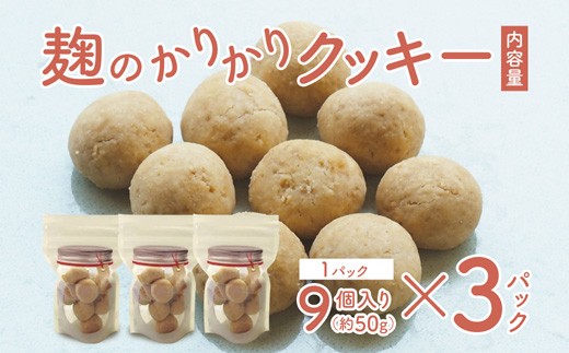 容量 | 麹のかりかりクッキー9個入り×3パック(約50g/1パック) ▼原材料 米粉・バター・てんさい糖・甘酒・米麹・加糖練乳(生乳、ショ糖)・塩 |